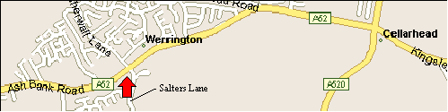 From either direction, you will approach Werrington on the A52. In the centre of Werrington, you will come to the cross roads. The hall is situated on this junction, right next to St. Philips Church. The car park is reached by turning into Salters Lane at the lights